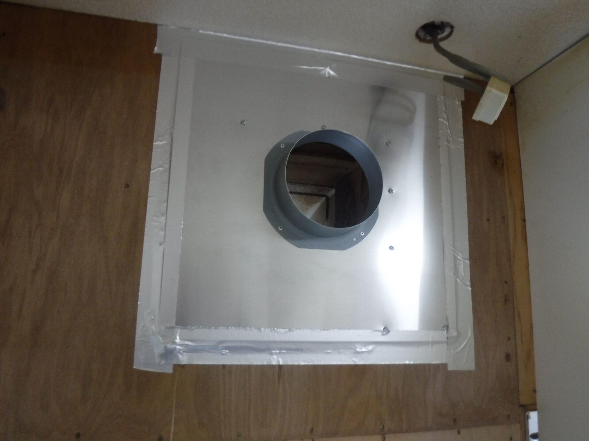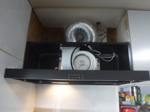 いつも大変お世話になっているM様宅のレンジフード、使用中に異音がする、などの不具合があり、取替えさせてもらいました。今までは排気口が30センチ角でしたが、今回のはシロッコファンなので、排気口にアタッチメントを取付て、ダクト接続が出来るようにしました。M井さんのご協力もあり、調子よく取付けする事が出来ました。M井さん、今回お世話になり、