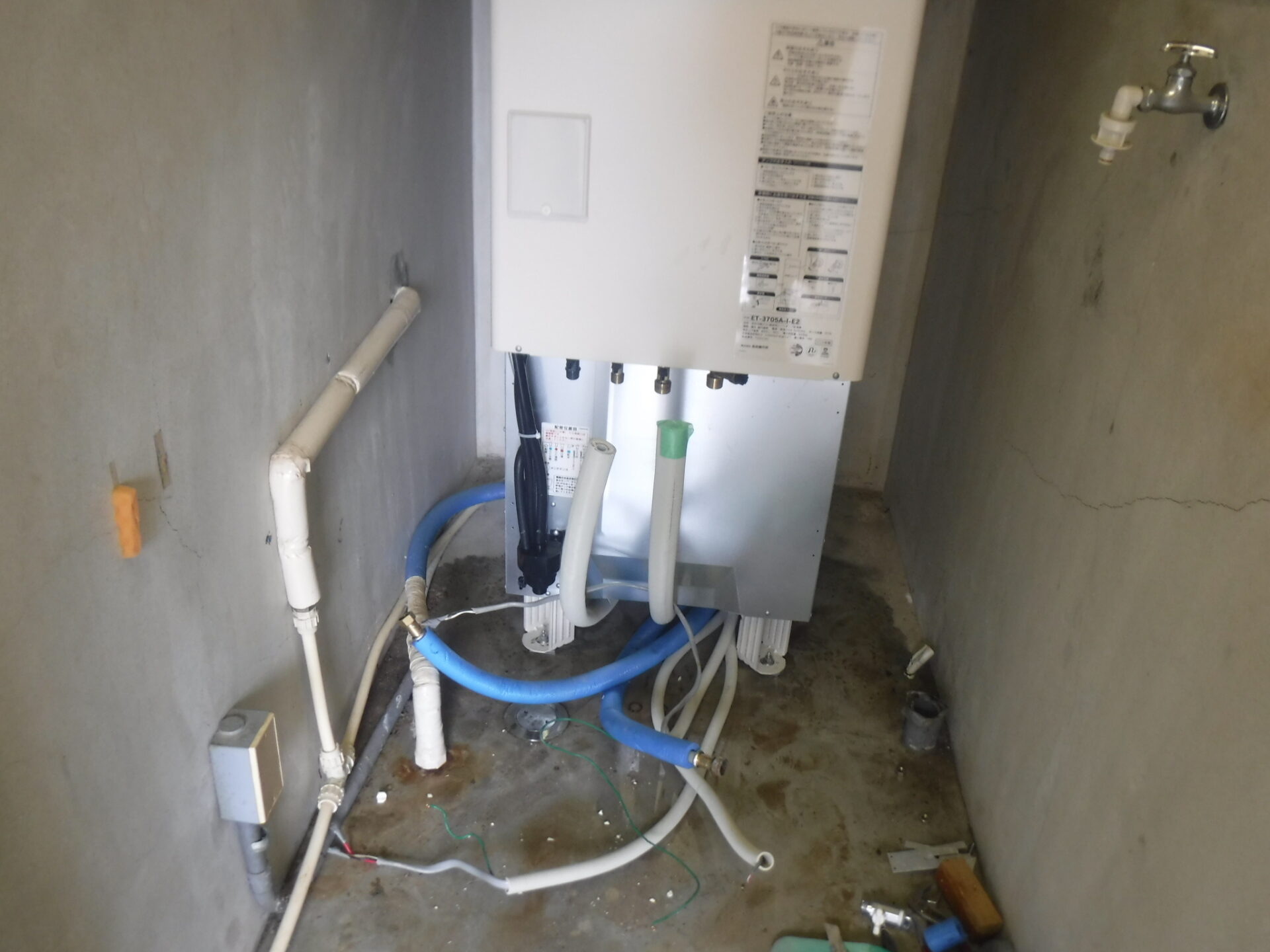 Nさんが、『ここは井戸水などで・・・』と言われ納得しました。井戸水は酸が強いので、銅配管を溶かして穴が空く事があり、Nさん宅もこのため水漏れしてた訳です。既に13年ご使用されて修理不可でしたので、長府製 井戸水対応のエコキュートに取替えさせてもらいました。本体が狭い場所に入っていたので取外しに手間取りましたが、無事に工事が完了できて良かったです。N様ありがとうございました(o^―^o)ニコ